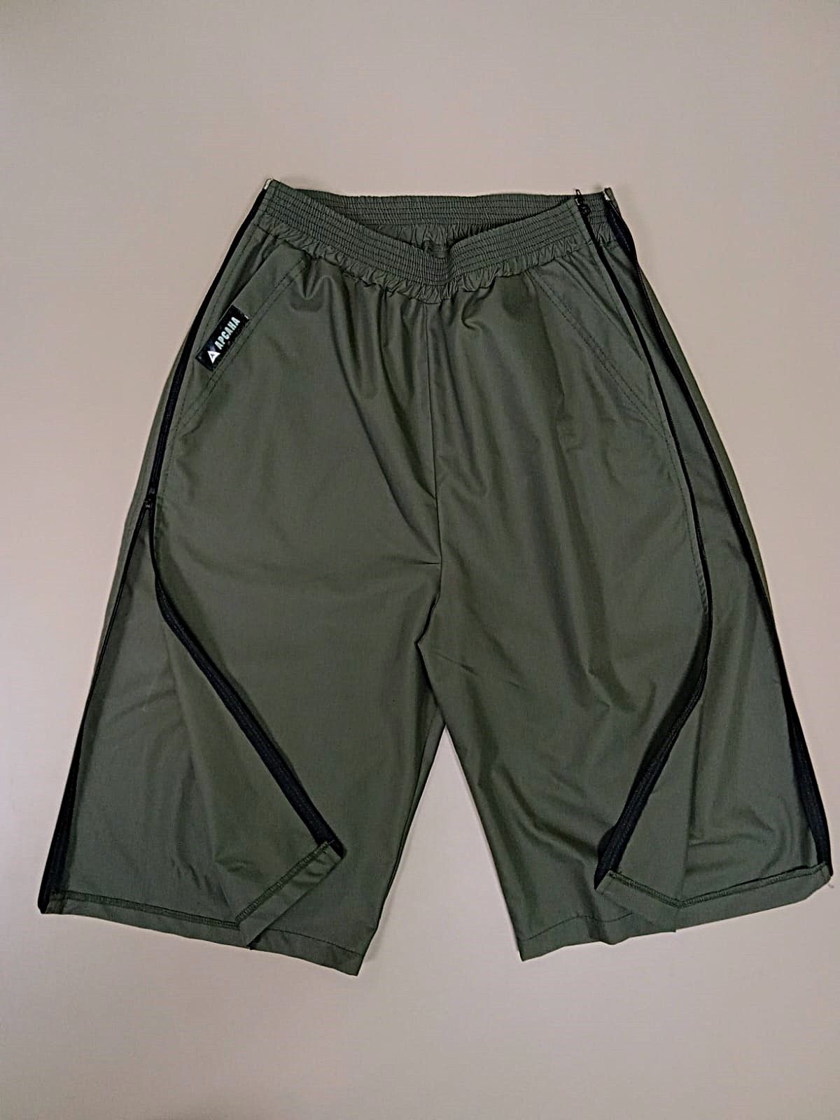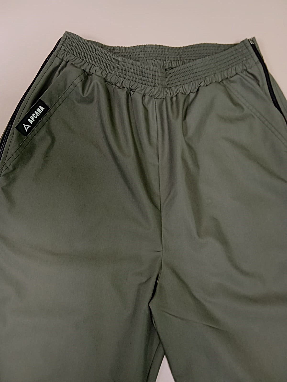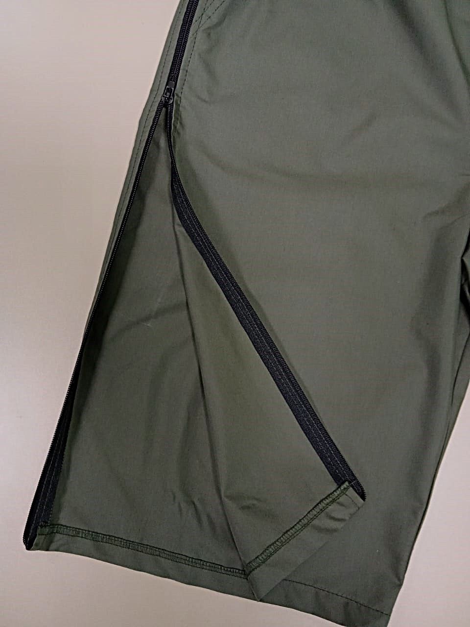 Отличительной особенностью является наличие 2 молний по бокам по всей длине штанины. Расстегиваются снизу вверх. Имеют комфортную посадку, прорезные карманы сбоку, пояс на эластичной резинке, который регулируется шнурком.