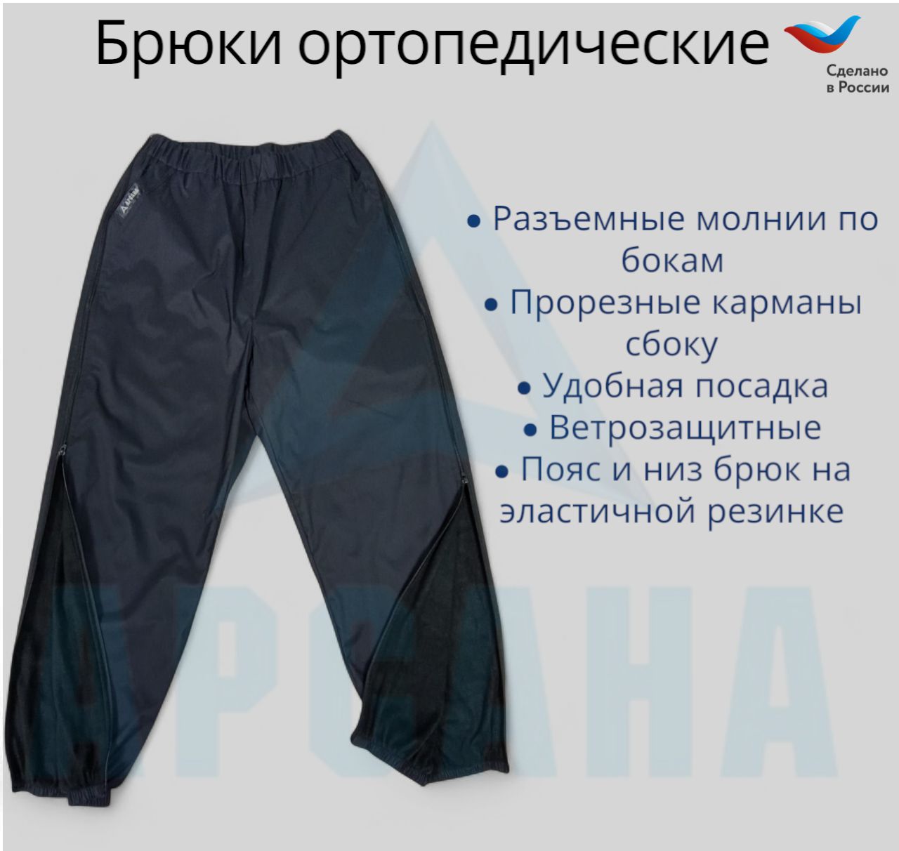 Ортопедические межсезонные брюки (до 0) с молниями по бокам относятся к категории адаптивной одежды. Рекомендованы для упрощения и облегчения процесса надевания в период после операций и травм. Используются при установленном гипсе, аппарате внешней фиксации Илизарова, шинах, повязках. Также применяются при последствиях после инсульта и паралича, пациентов, передвигающихся на инвалидных колясках, лежачими больными. Удобны в использовании с протезами нижних конечностей.