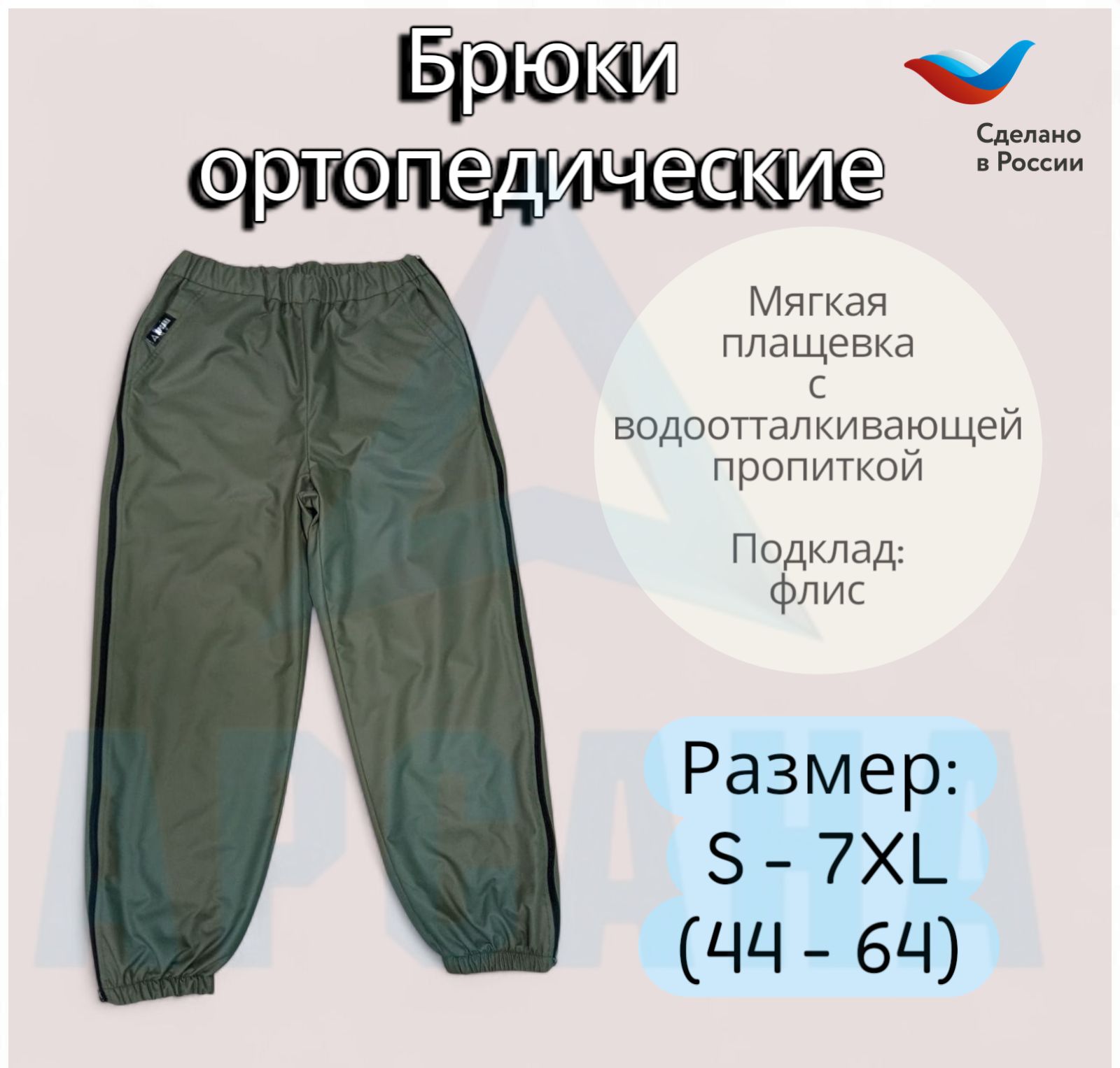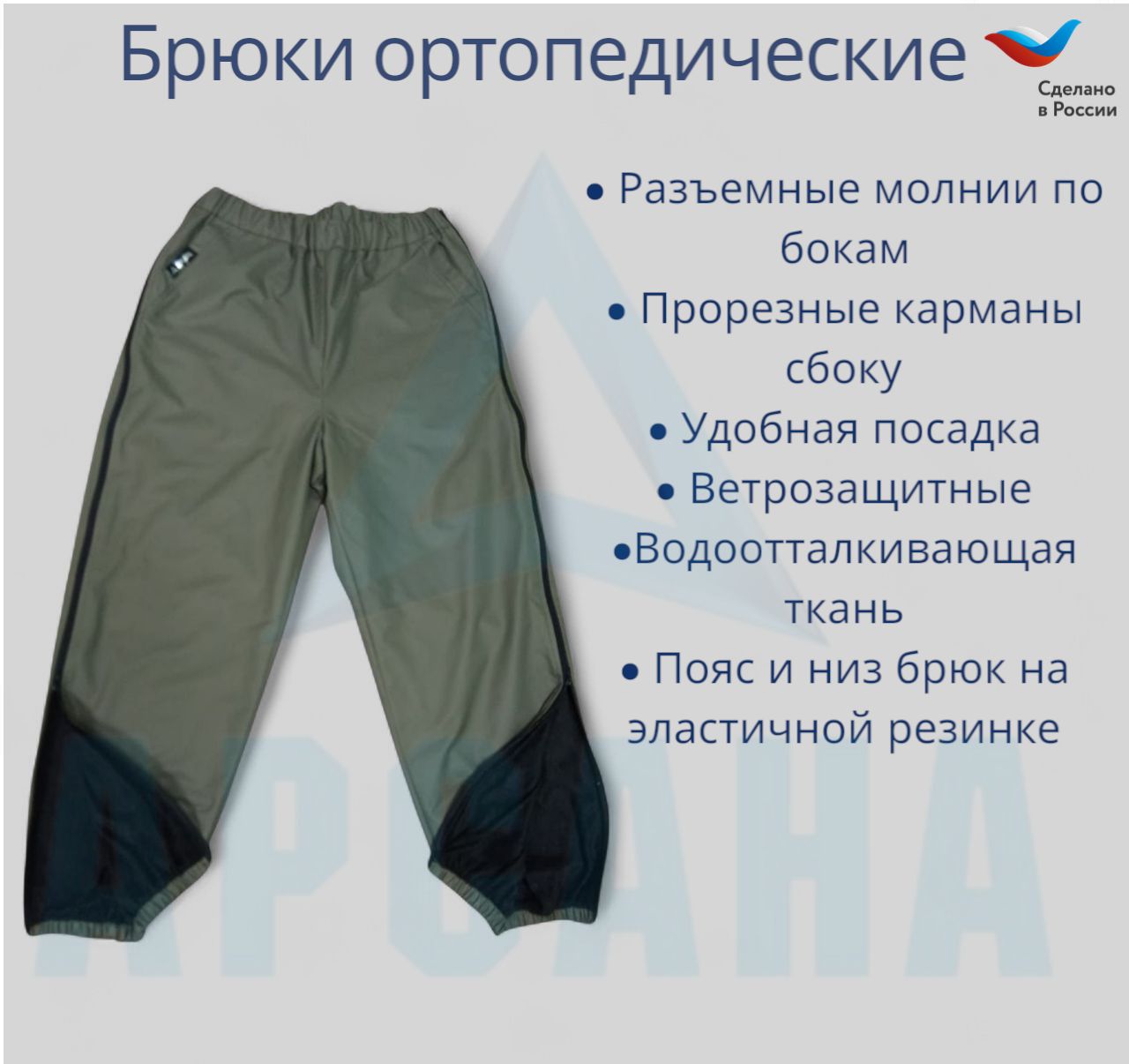 Ортопедические межсезонные брюки (до 0) с молниями по бокам относятся к категории адаптивной одежды. Рекомендованы для упрощения и облегчения процесса надевания в период после операций и травм. Используются при установленном гипсе, аппарате внешней фиксации Илизарова, шинах, повязках. Также применяются при последствиях после инсульта и паралича, пациентов, передвигающихся на инвалидных колясках, лежачими больными. Удобны в использовании с протезами нижних конечностей.