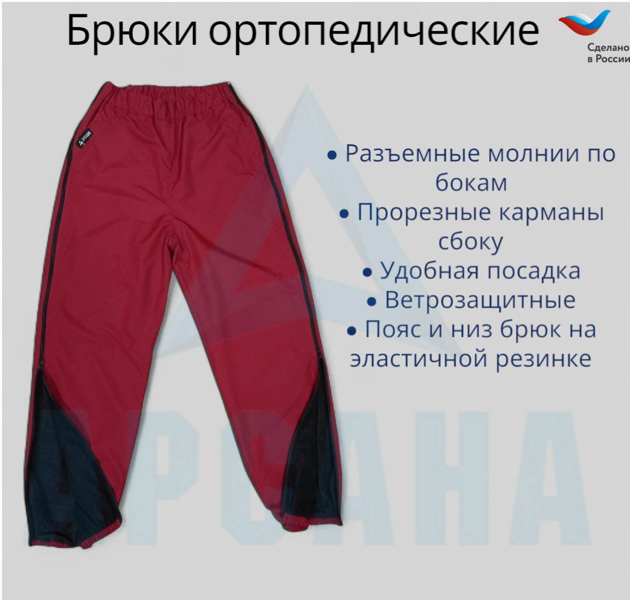 Ортопедические межсезонные брюки (до 0) с молниями по бокам относятся к категории адаптивной одежды. Рекомендованы для упрощения и облегчения процесса надевания в период после операций и травм. Используются при установленном гипсе, аппарате внешней фиксации Илизарова, шинах, повязках. Также применяются при последствиях после инсульта и паралича, пациентов, передвигающихся на инвалидных колясках, лежачими больными. Удобны в использовании с протезами нижних конечностей.