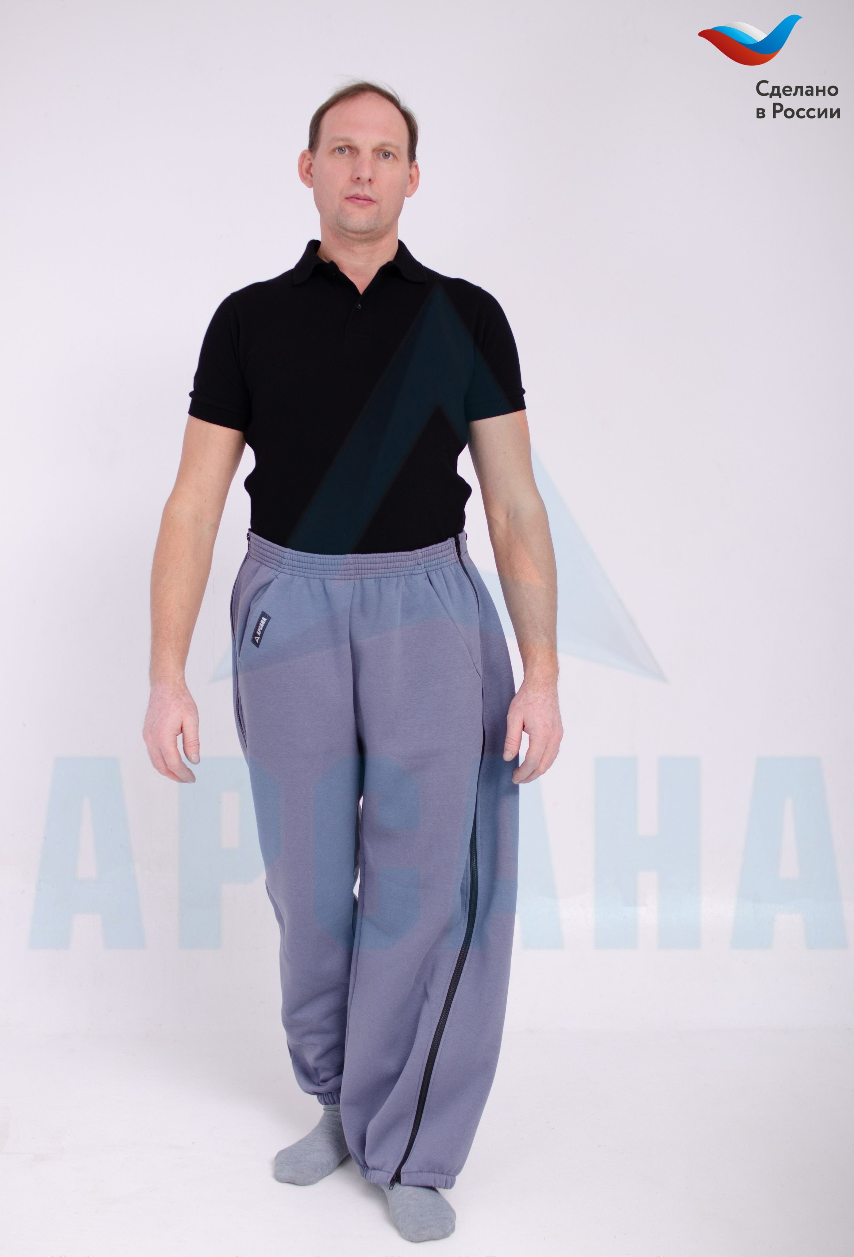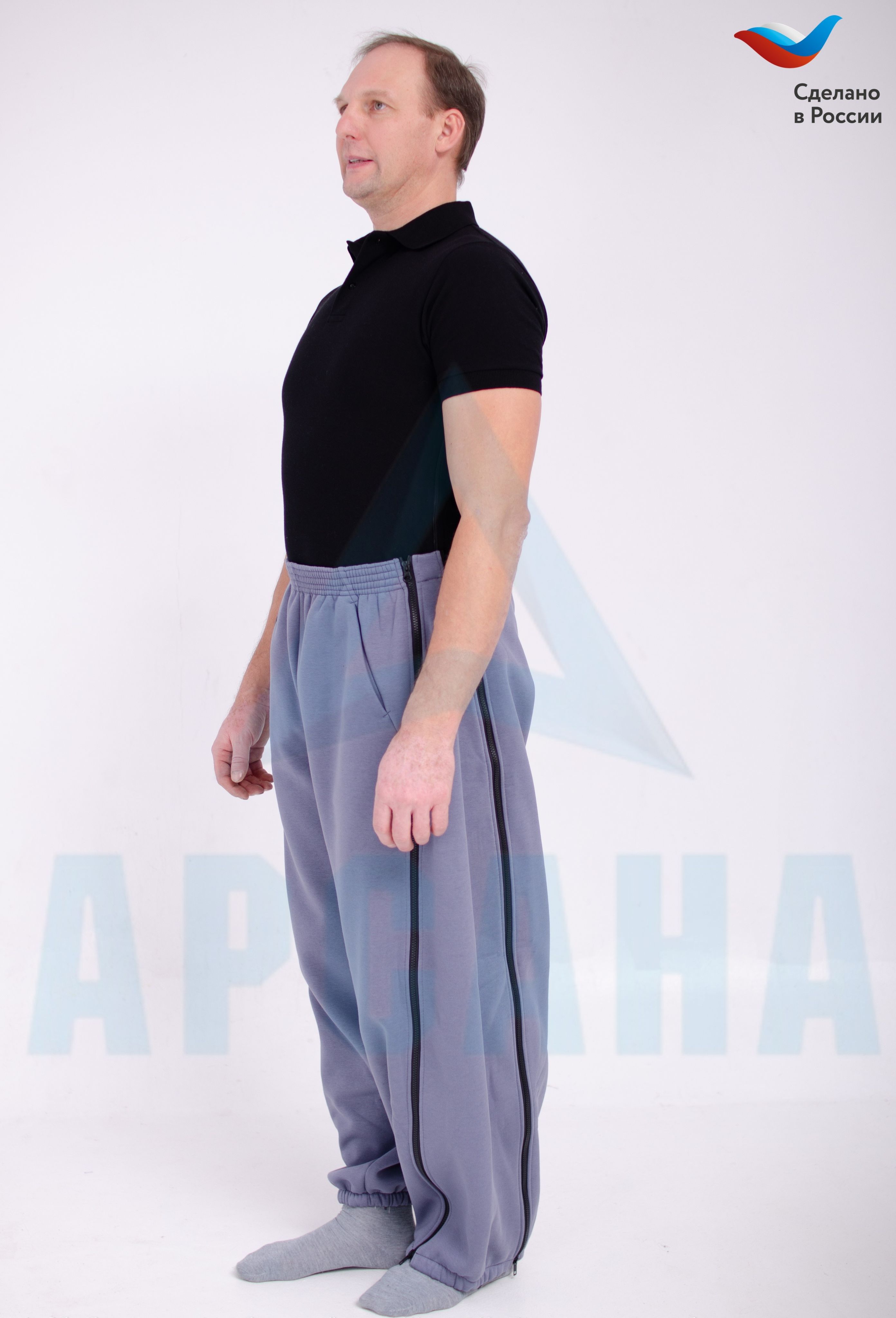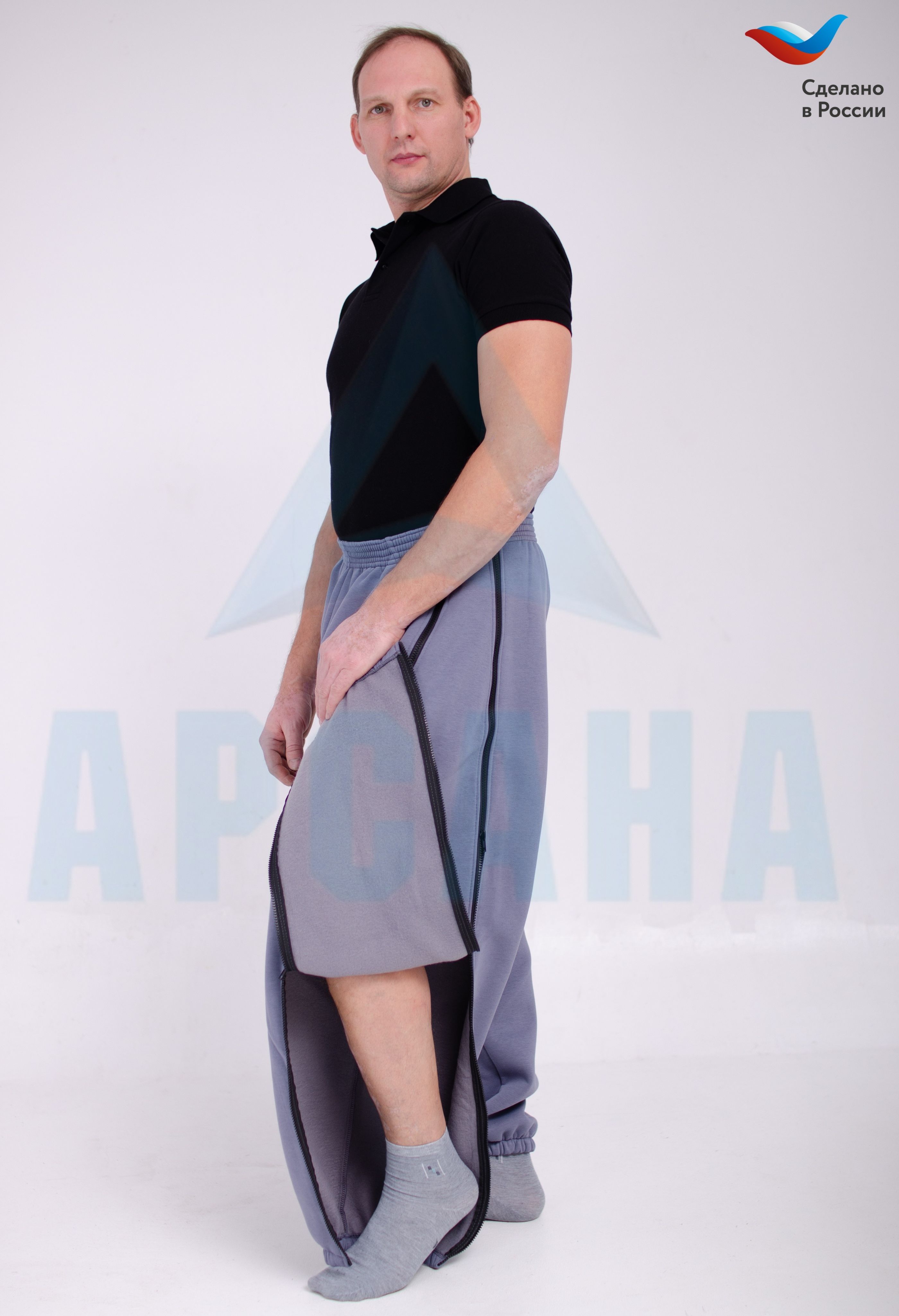 Отличительной особенностью является наличие 2-х молний по бокам по всей длине штанины и съемной вставкой, которую можно использовать как на правой, так и на левой ноге. Расстегиваются снизу вверх. Имеют комфортную посадку, карманы сбоку, пояс на эластичной резинке со шнурком. Благодаря свободному крою не стесняют движений. Идеальны для повседневной носки. После снятия аппарата вставку можно отстегнуть и носить брюки привычного фасона. Инструкция по применению. Если необходимо переставить вставку на другую сторону: