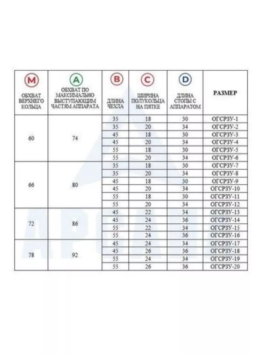 ОГСРЗУ-12: обхват верхнего кольца - 66 см, обхват по максимально выступающим частям аппарата - 80 см, длина чехла - 55 см, ширина полукольца на пятке - 20 см, длина стопы с аппаратом - 34 см.