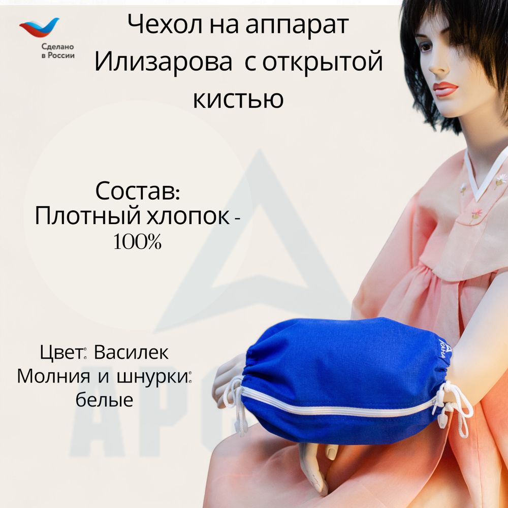 Защитный чехол с открытой кистью на аппарат Илизарова обеспечивающего комфортную фиксацию конечностей без давления. Модель с открытой кистью разработана с пониманием важности подвижности пальцев и соблюдения гигиены. Открытая зона для свободных движений кисти идеально сочетается с лечебными процедурами.