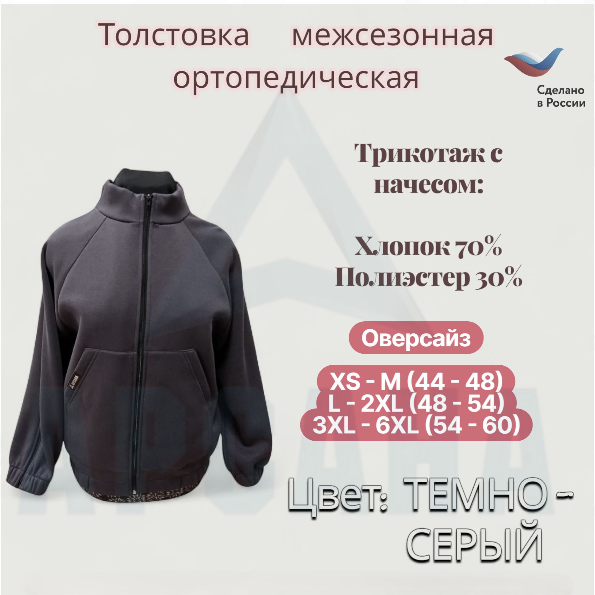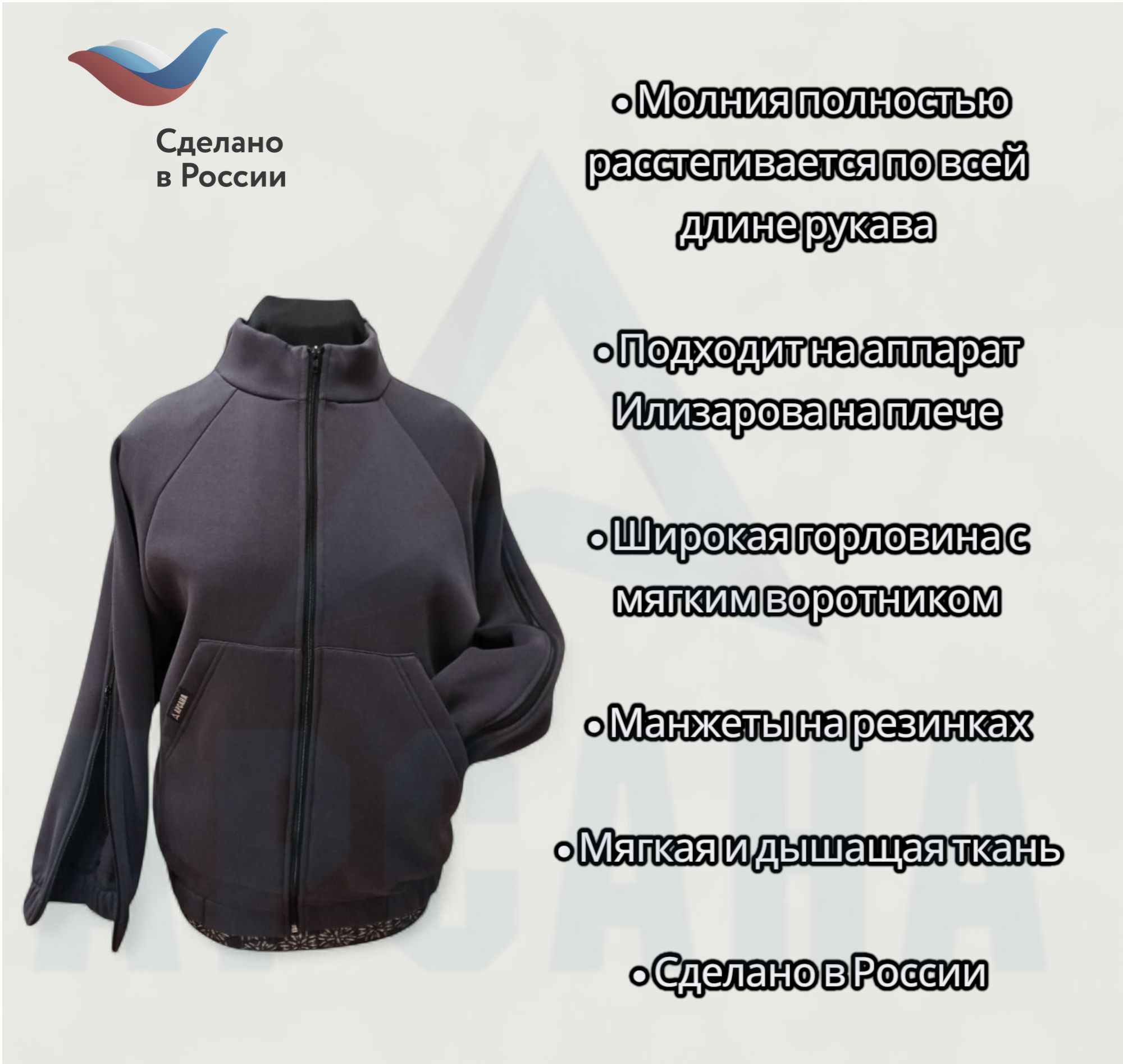 Толстовка межсезонная ортопедическая с молниями по верху - полностью расстегивающийся рукав с молнией по всей длине – от плечевого шва до манжеты. Позволяет легко надевать поверх гипса, ортезов, аппарата Илизарова без причинения дискомфорта.