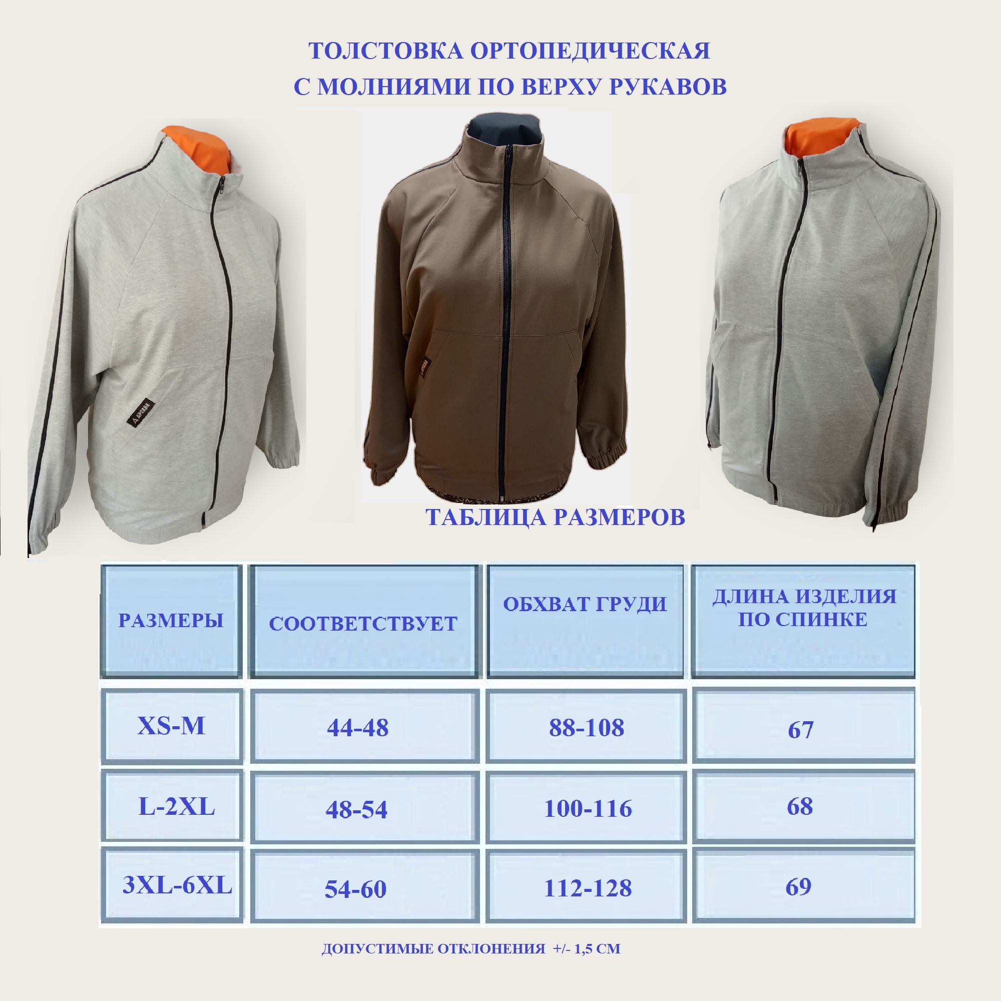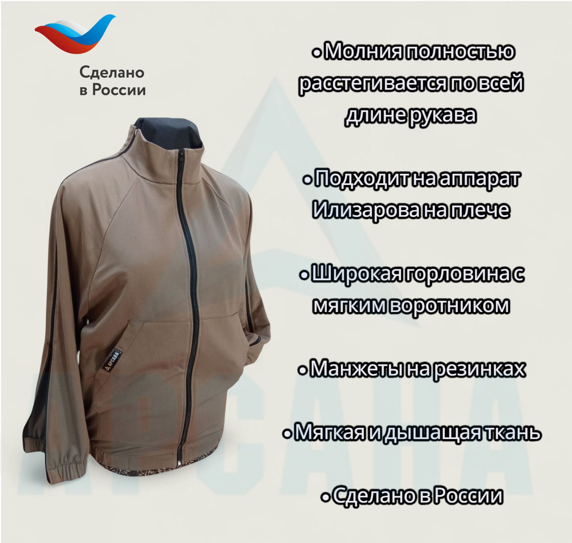 Толстовка ортопедическая с молниями по верху - полностью расстегивающийся рукав с молнией по всей длине – от плечевого шва до манжеты. Позволяет легко надевать поверх гипса, ортезов, аппарата Илизарова без причинения дискомфорта.